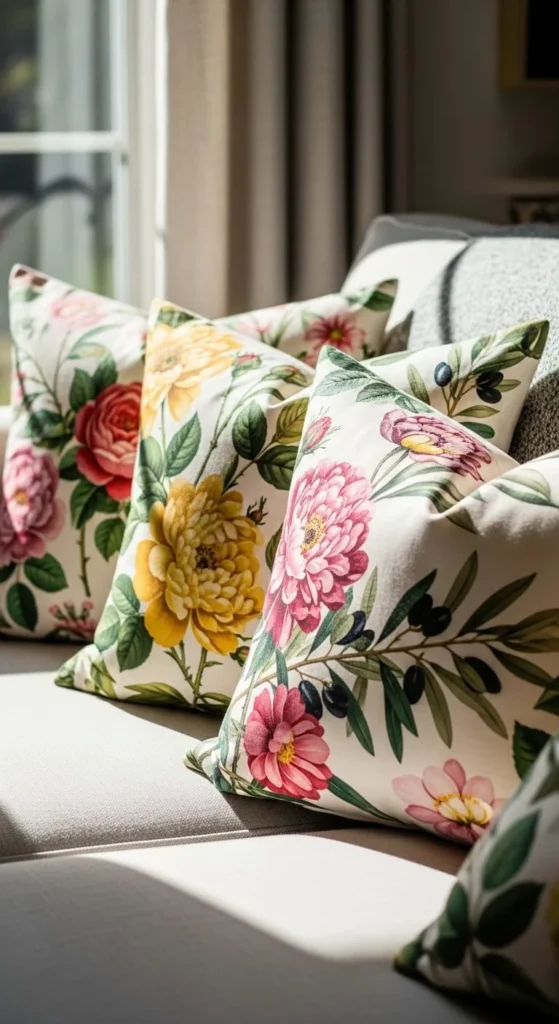 Floral pillows work well with neutral furniture. A beige couch or white bedspread becomes lively once floral patterns appear.