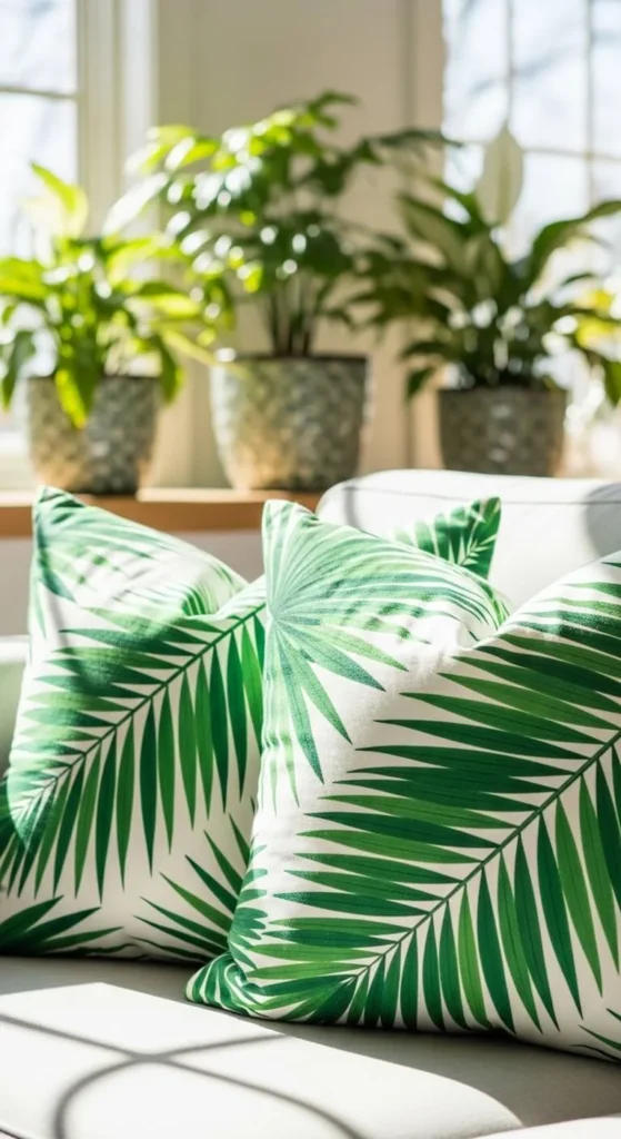 Pair tropical pillows with real indoor plants like a snake plant or monstera. The room feels fresh and welcoming.