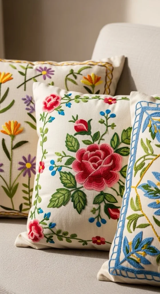 Small floral embroidery or geometric stitching looks beautiful on cotton or linen covers.