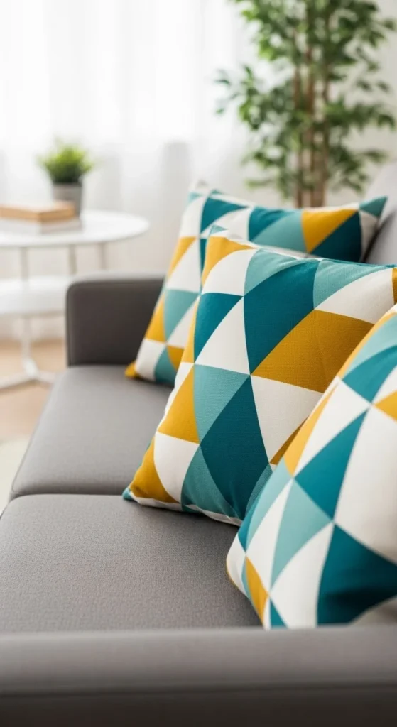 Geometric pillows suit apartments, offices, and modern living rooms.